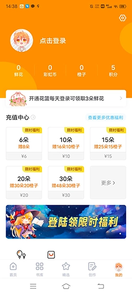 用户可在此处为花篮充值,也能通过签到免费领取限时福利;另外,用户登录账号的积分、彩虹币等信息也可在这里查询。