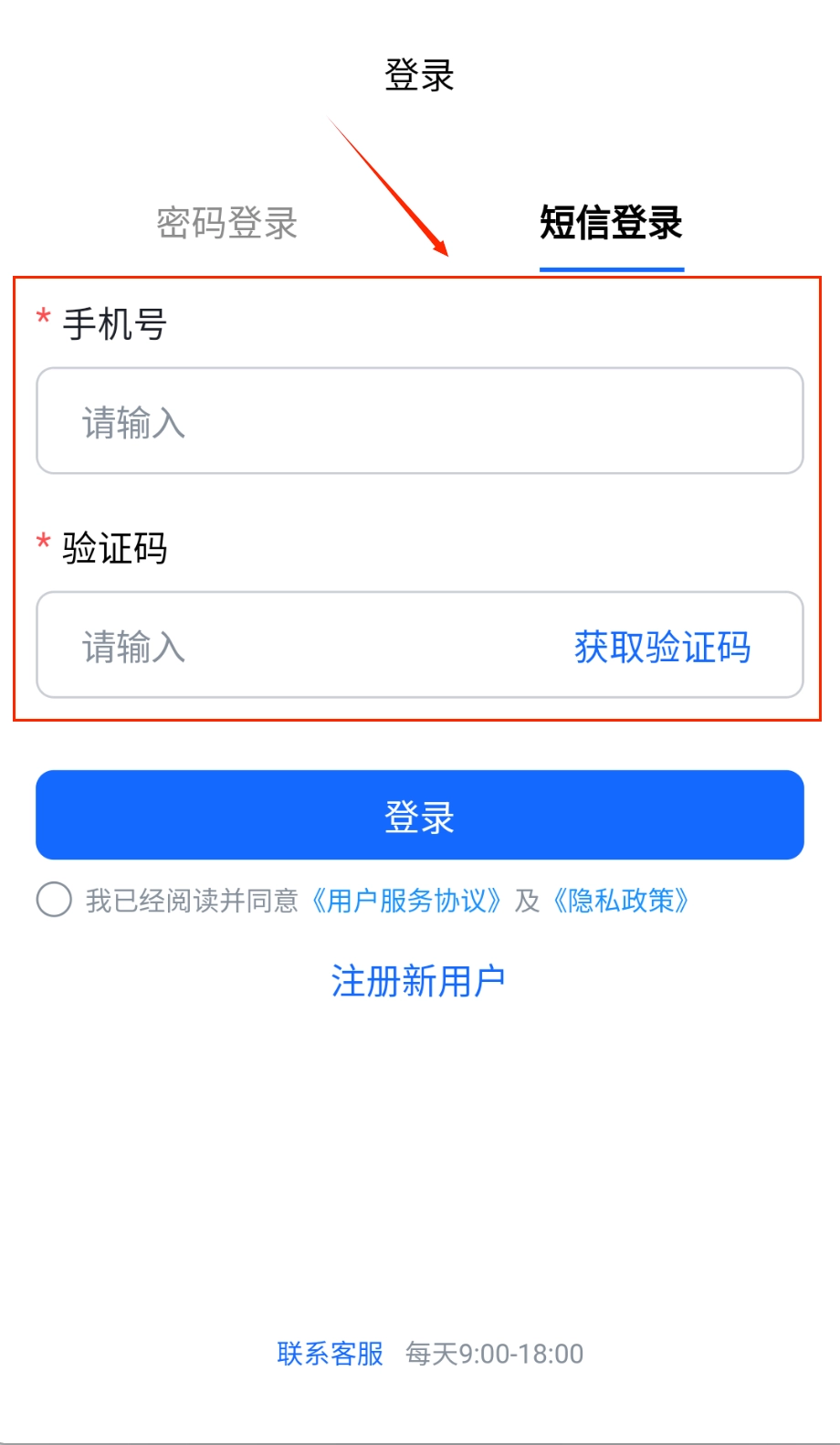 登录可以选择密码或者短信验证的方式哦,先输入手机号获取验证码并填写好,记得勾选相关协议,然后点击蓝色的登录按钮就可以啦。