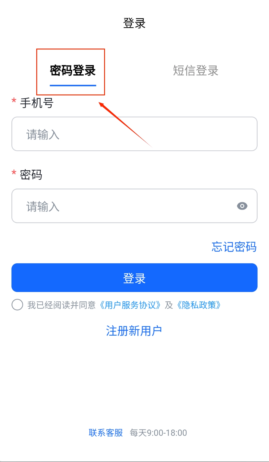 密码登录时若输错,可点击“忘记密码”进行重置;点击眼睛图标能查看输入的密码内容;另外,记得勾选相关协议,这样才能成功登录哦。