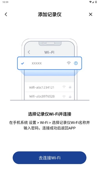 在手机的系统设置里找到“Wi-Fi”选项,选择记录仪对应的Wi-Fi名称,输入密码完成连接后返回即可。