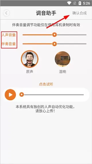 3、录制完成后,可以试听调整人声和伴奏,点击右上角确认合成;