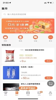 2、在集市中,用户可以购买饲料、设备、等物品,但是用户需要先与厂商电话咨询并待厂商为您开户后,才可以进行购买