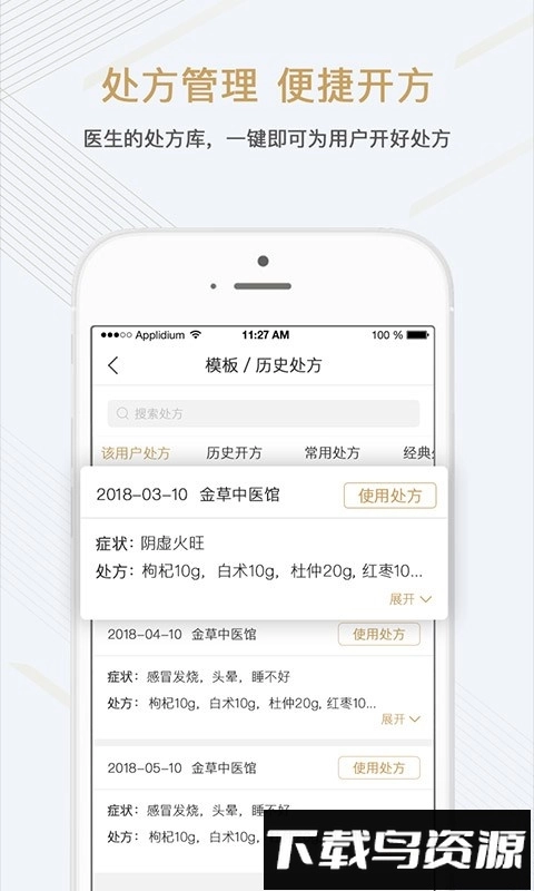 复诊开方操作:绑定历史就诊记录后可直接申请复诊,医生可调阅以往病历快速开具处方,简化诊疗流程;