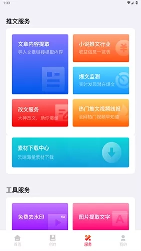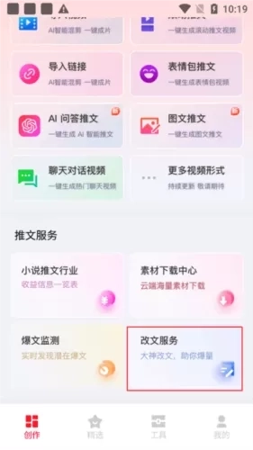 除此之外,还有超多功能为你提供,比如免费去水印、图片提取文字、三联封面等,帮助你创作出更加优质的小说推文视频。当然,还有爆文监测、改文服务等附加功能,让你可以快速找到新的素材,让你创作不间断。你也可以邀请自己的好友一起参加,推广软件就可以升级成为代理商,邀请好友就可以绑定关系,获取额外的收益,有需要的用户快来试试吧!