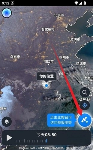 接着进入卫星地图界面,点击右下角的蓝色按钮就能查看预报图。