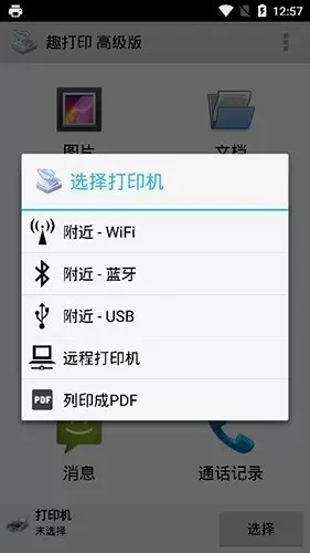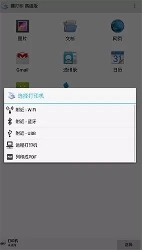 当打印机设备均正常连接完毕,便可点击文件。在主页面上,我们能够选择要打印文件的类型,诸如图片、文档、网页、邮件、通讯录、日历以及短信通话记录等。