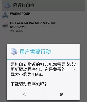 在附近打印机中找到设备后,点击设备会提示要安装驱动包,一定要安装,否则无法打印。