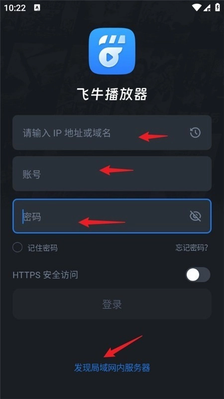 打开飞牛播放器后,依次填写IP地址或域名、个人账号及密码,最后点击登录按钮就能完成操作。