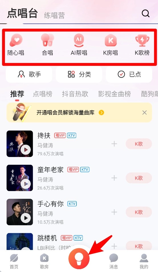 点击“点唱台”,可以选择随心唱、AI帮唱、合唱等多种不同的演唱方式。