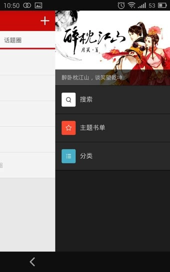 点击右侧的加号按钮后,会弹出搜索、主题书单和分类这三个选项。