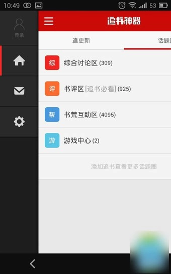 首界面左上角设有可点击按钮,点击后会显示登录、主页、消息和设置选项。