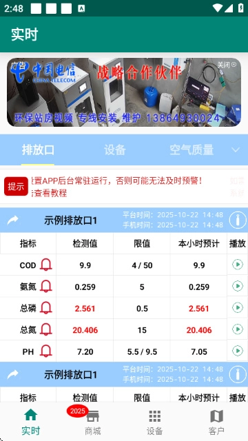 进入“实时”板块后,能够查看排放口(例如示例排放口1)的COD、氨氮、总磷等各项指标的检测值、限值等相关数据。
