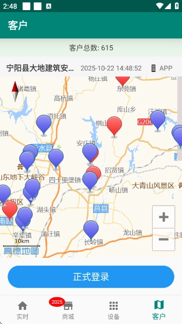 进入“客户”板块后,能查看客户的总数量以及分布地图,点击“正式登录”按钮,即可开展相关的客户管理操作。