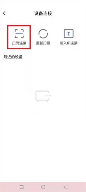 4、在设备连接页面,用户可以选择扫码连接或者手动输入电视IP地址的方式进行配对。
