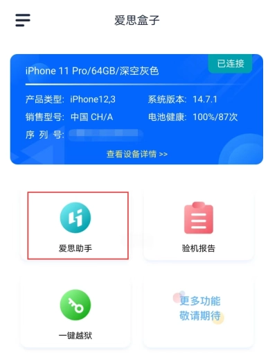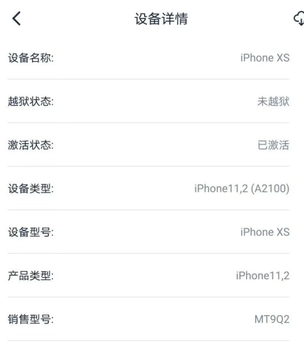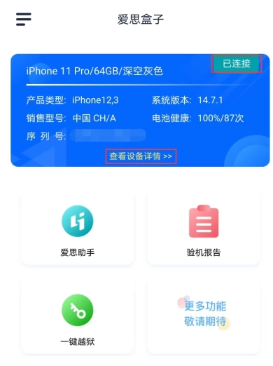 此时可点击下方的“查看设备详情”,查看iPhone的详细信息,涵盖越狱状态、序列号、ECID、生产日期、电池寿命、固件版本等内容。