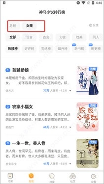 选择小说类型后,还能看到软件里提供的热搜、好评、完结、飙升、新书等各类榜单。