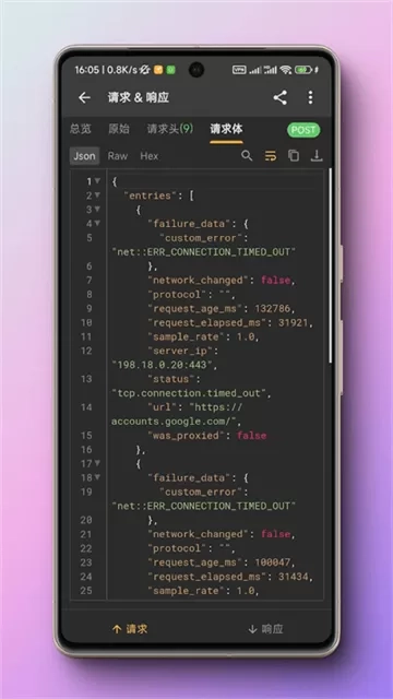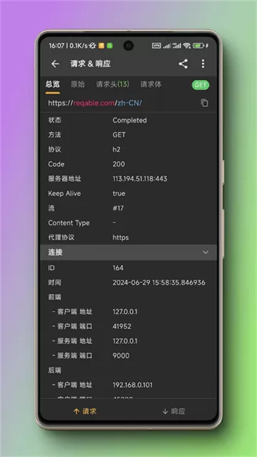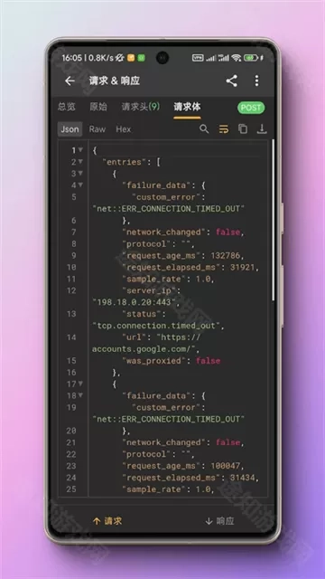 HttpCanary能够让用户浏览网络请求的整体概况,其中涵盖URL、HTTP协议、HTTP方法、响应码、服务器Host、服务器IP与端口、Content-Type、Keep-Alive、时间信息以及数据大小信息等内容。