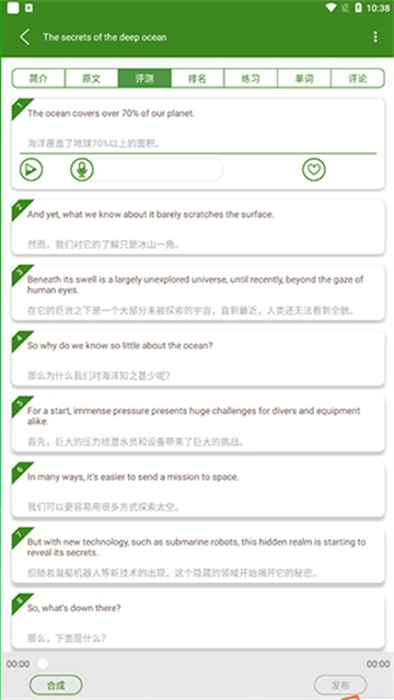 软件的优势正体现于此:它支持在线播放原文,你能通过中英文对照来理解文章内容,也可以选择隐藏中文,仅保留英文显示。