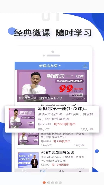 在内可选择经典微课(如新概念英语课程),按需购买后随时学习,课程采用手绘漫画、情境视听等形式辅助记忆。