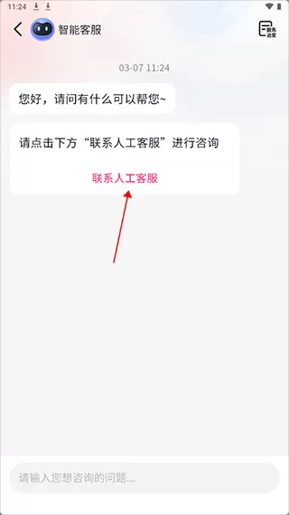 3、然后在打开的智能客服页面中点击【联系人工客服】即可