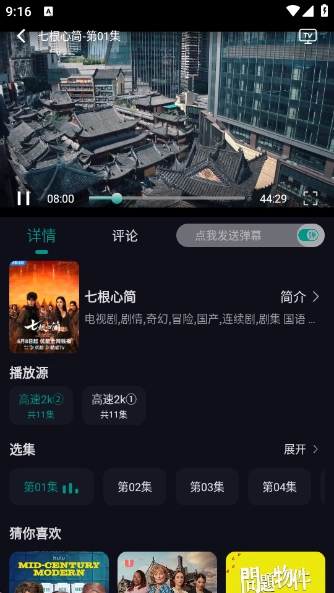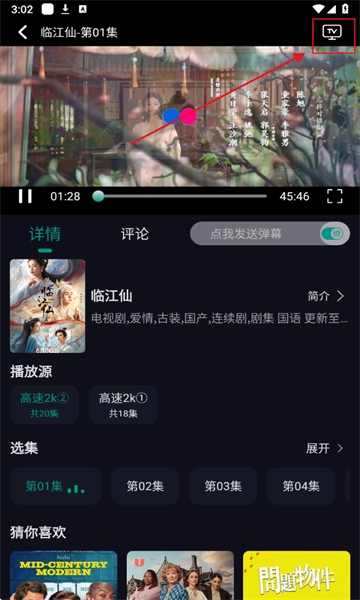 一键打开进入播放详情页,点击右上角"tv"标志。