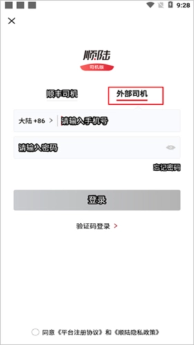 在本网站将软件安装到手机后,进入软件进行注册登录账号信息时,若不是顺丰员工,请选择外部司机注册。