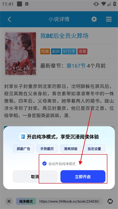 接着打开进入详情页面,点击“立即开启”按钮,就能开启纯净模式阅读了。