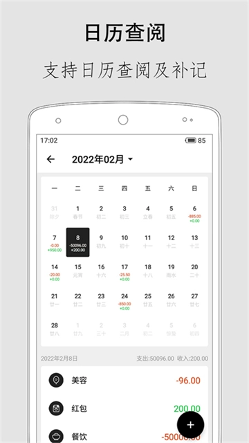 日历检查:可快速查看每月账单,每天的费用明细一目了然。