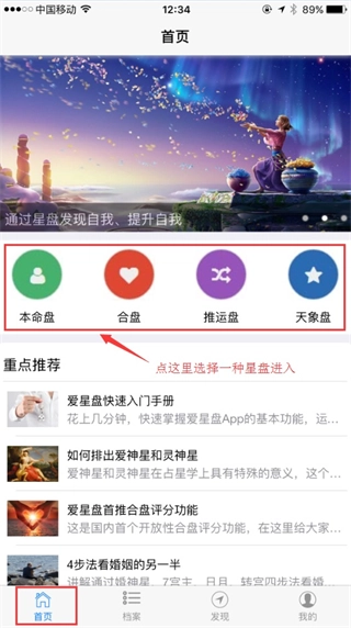 或者进入星盘档案页面(前提是你得先有爱星盘的账号并完成登录),点击星盘条目就能进入。