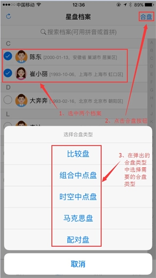 或者进入星盘档案页面,挑选两个档案,点击右上角的“合盘”按钮,在弹出的合盘类型选项里选择所需的合盘类型。