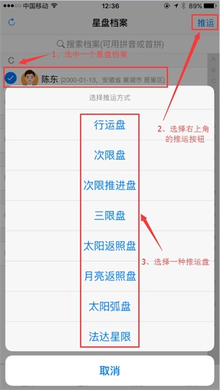 参考上面对应的“如何进行排合盘”流程,只是在星盘档案页面,仅需选择一个档案就可以了。