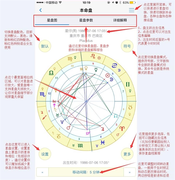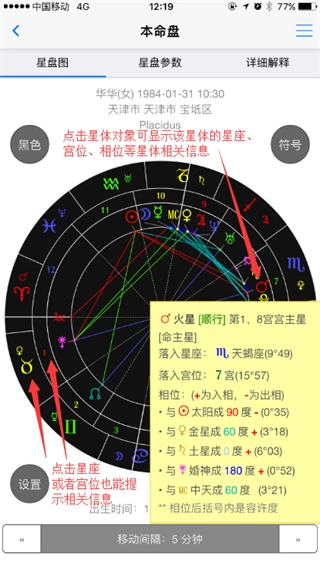 点击底部的“星盘移动间隔”按钮,可选择不同的星盘移动时间间隔;随后通过左右两个按钮,对星盘时间(本命盘时对应出生时间,推运盘时对应推运时间)按照所选时间间隔进行增减,以此转动星盘。