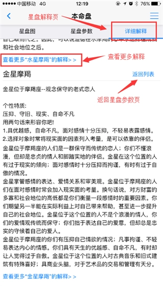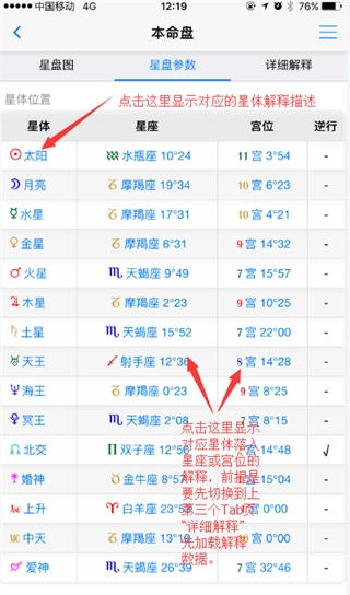 你可以通过点击顶部的Tab选项,或者用手指在屏幕上左右滑动,来切换星盘图、星盘参数列表以及详细星盘解释这三个内容。