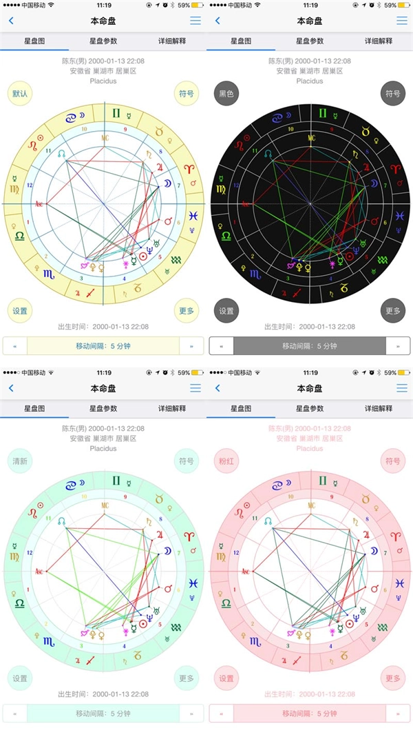 多种星盘配色和样式,符号版、文字版、专业版三种模式,组合成128中星盘外观;