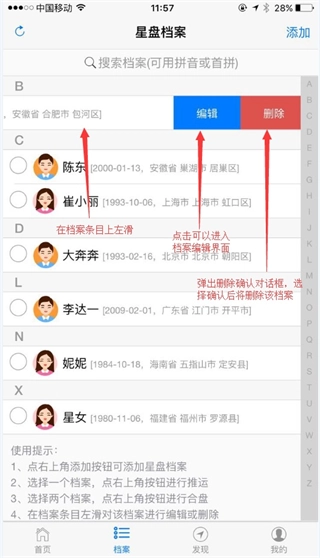 在档案列表中,长按某条档案条目并向左滑动,就能调出该档案的操作菜单,借助这个菜单你可以对档案执行编辑或删除的操作。