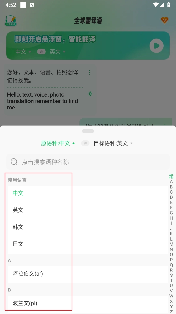 一键点击语言,可以滑动或直接搜索所需的翻译语言。