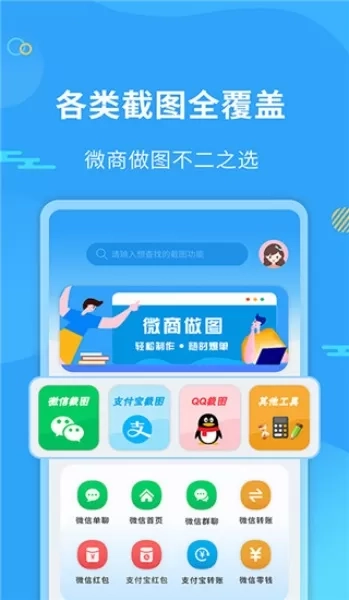 1. 该软件能够支持在微信、支付宝、QQ平台上进行制图操作,可生成20余种不同类型的图,而且能免费一键生成相关截图。