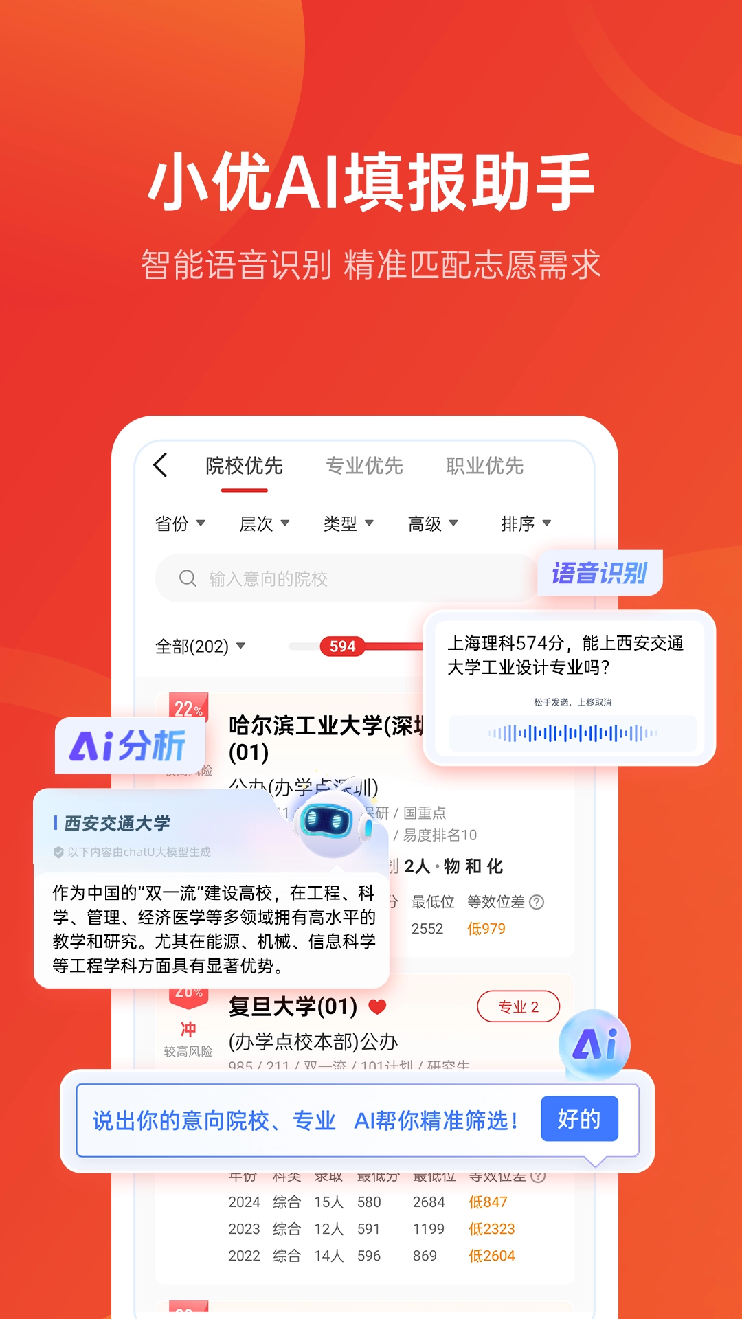 优志愿可为用户提供高考志愿AI填报服务,能依据用户平时的学习成绩智能匹配志愿需求。目前该平台还支持美术生等艺术生的志愿填报,通过运用AI大数据智能算法,助力用户获得更科学的志愿填报功能。平台内的数据与当年考试院发布的书本信息保持一致,同时也会为用户提供历年录取数据,帮助考生完成满意的志愿填报。