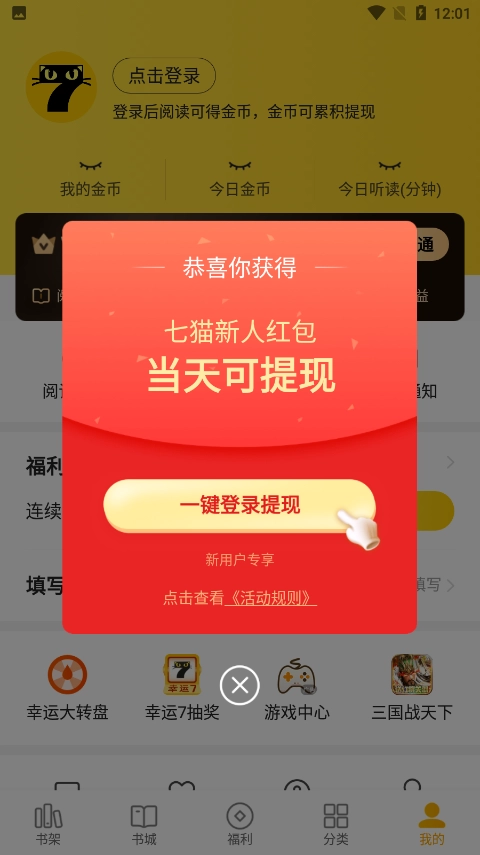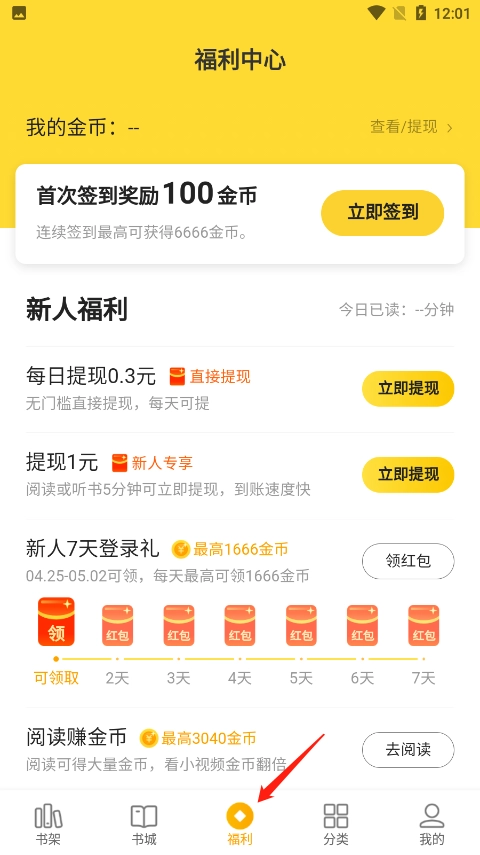 在福利页面里,列有我们获取金币的各类任务与途径,需要注意的是,新手福利仅限完成一次。