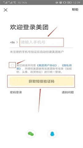 接着就会跳转到美团的登录界面,在这里输入想要更换的美团账号对应的【手机号码】,把【我已阅读】这个选项勾选上,然后点击【获取短信验证码】按钮,等收到验证码后填写进去,登录成功之后,美团账号的切换操作就完成了。