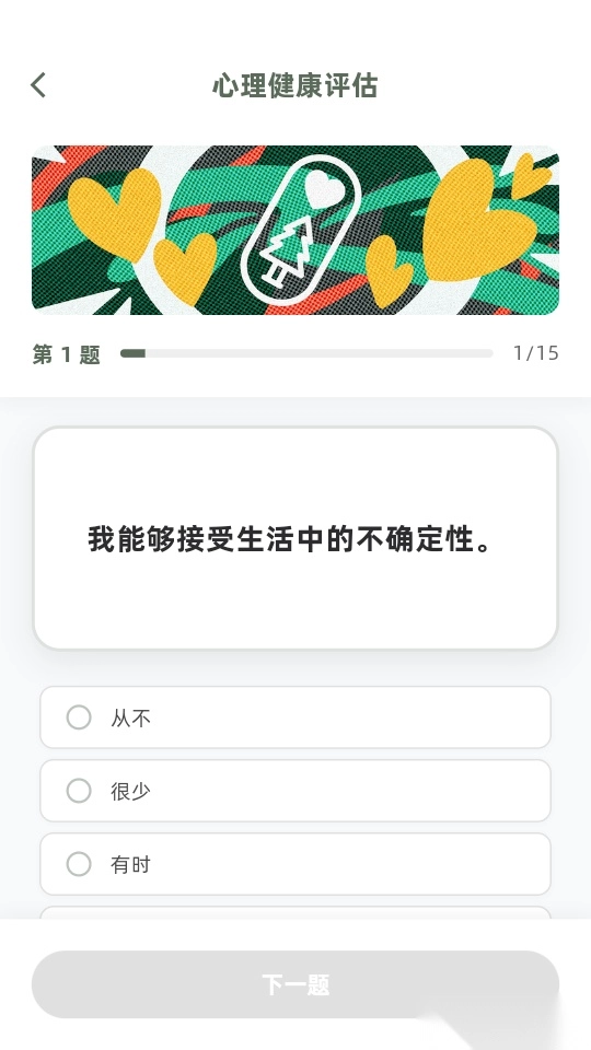 这样就能着手进行自己的心理健康评估,即刻进入答题环节。