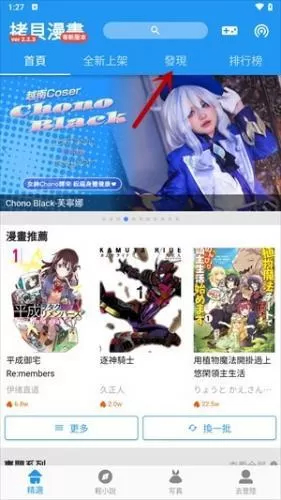 1、打开拷贝漫画,点击主页中发现,挑选漫画作品。