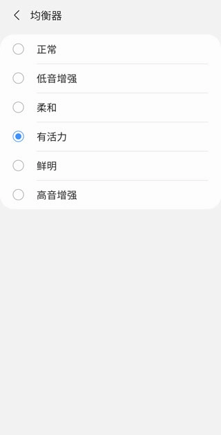 推荐将均衡器设置为“有活力”模式;PS:使用三星耳机时,选择“有活力”模式能获得更出色的音质体验。