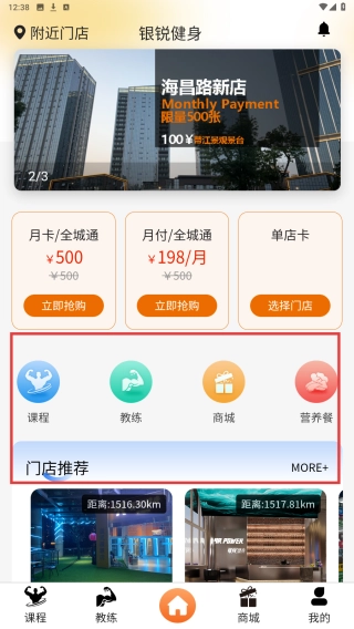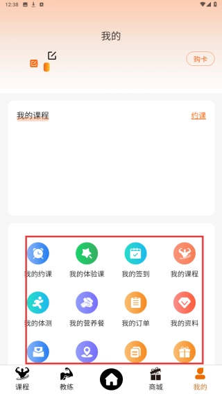 在首页找到【课程】【教练】【商城】【营养餐】这些入口,点击后就能选择对应的服务。
