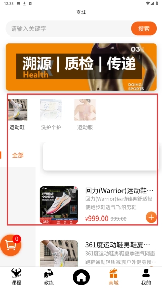 在商城页面浏览【运动鞋】【洗护个护】等分类板块,挑选合适的运动类商品进行购买。