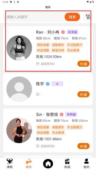 在教练页面找到【Ran・刘小冉】,查看她的擅长领域后,点击【约课】按钮即可预约课程。