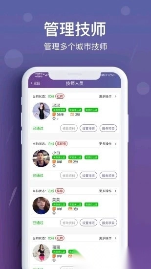 技师管理功能支持对多个城市的技师人员开展统筹化管理。