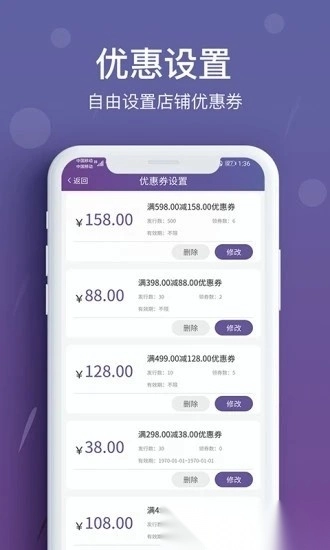 优惠设置功能支持商家依据自身需求,自主对店铺优惠券进行配置。