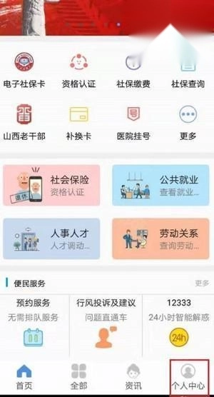 1、在本站安装民生山西,然后打开,点击右下角的个人中心,点击进入;