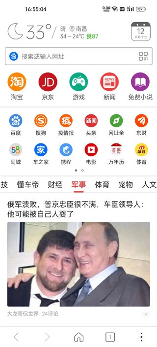 打开浏览器后,能看到涵盖军事、科技、历史、社会、娱乐、体育、宠物、人文等类别的各类资讯。